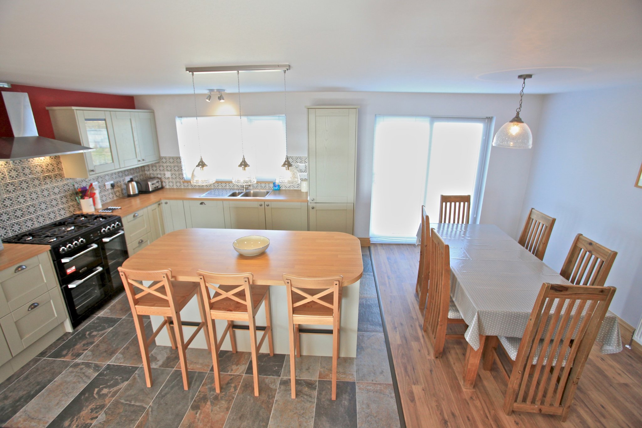 - The spacious kitchen is well equipped with a range cooker, fridge freezer, microwave, dishwasher and coffee machine as well as plenty of crockery, cutlery and utensils. Patio doors lead to a decked area and the garden to the rear of the property.