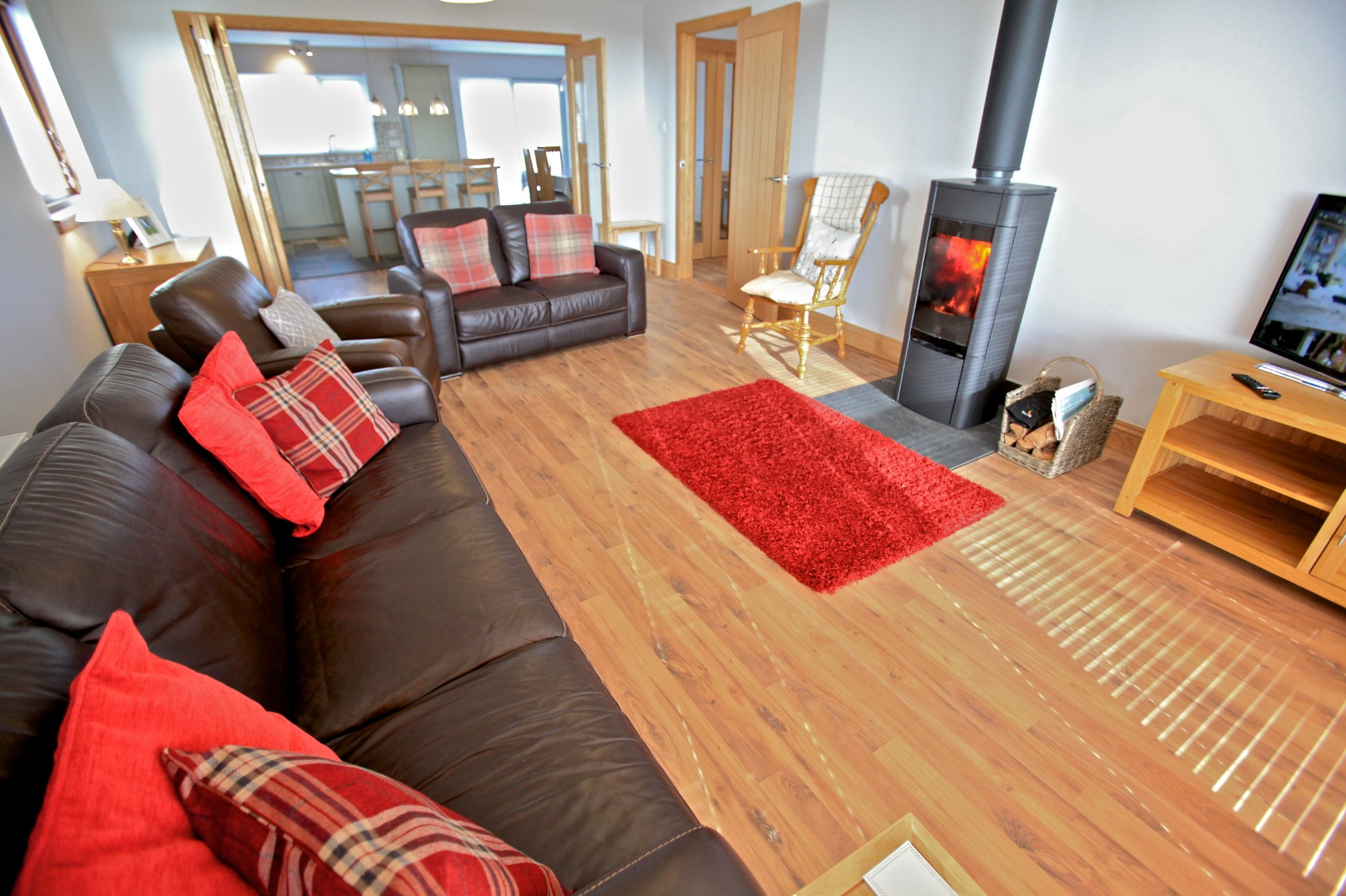 - The house has an open-plan living area with a multifuel stove. In the living room there is a 40” smart television and DVD player.