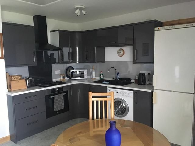 Open plan living area with kitchen/dining area and lounge. Fully fitted kitchen with top quality appliances including oven, hob, cooker hood, large fridge freezer, washing machine and microwave. Equipped with all the cutlery, crockery, utensils and storage space you will need to facilitate your stay. Oak dining table with matching chairs where you can dine while enjoying the panoramic view over the sea and headland at Trebister Ness.