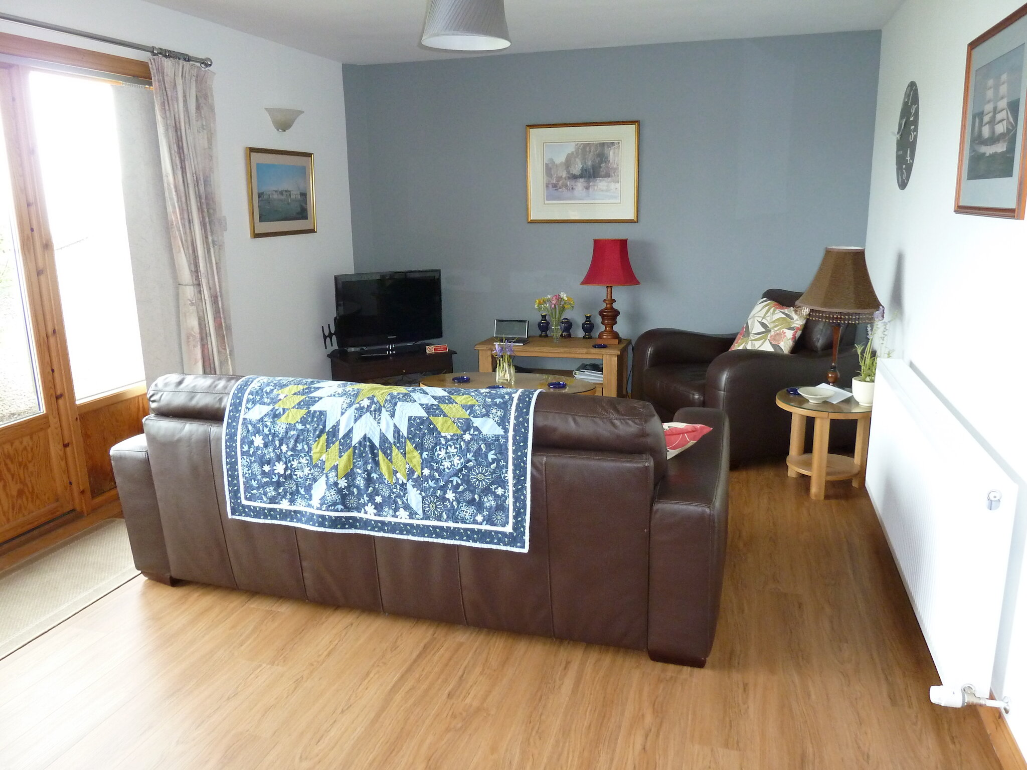 Lounge area with leather sofa and matching armchairs. LED TV with Freeview channels, bluetooth music speaker and a selection of books and games. Large central heating radiator.