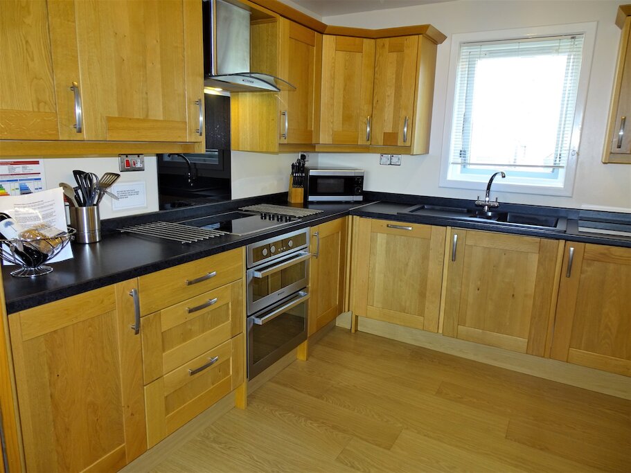 There are two double bedrooms with quality solid oak furniture, large fitted wardrobes and LED TVs with Freeview channels.