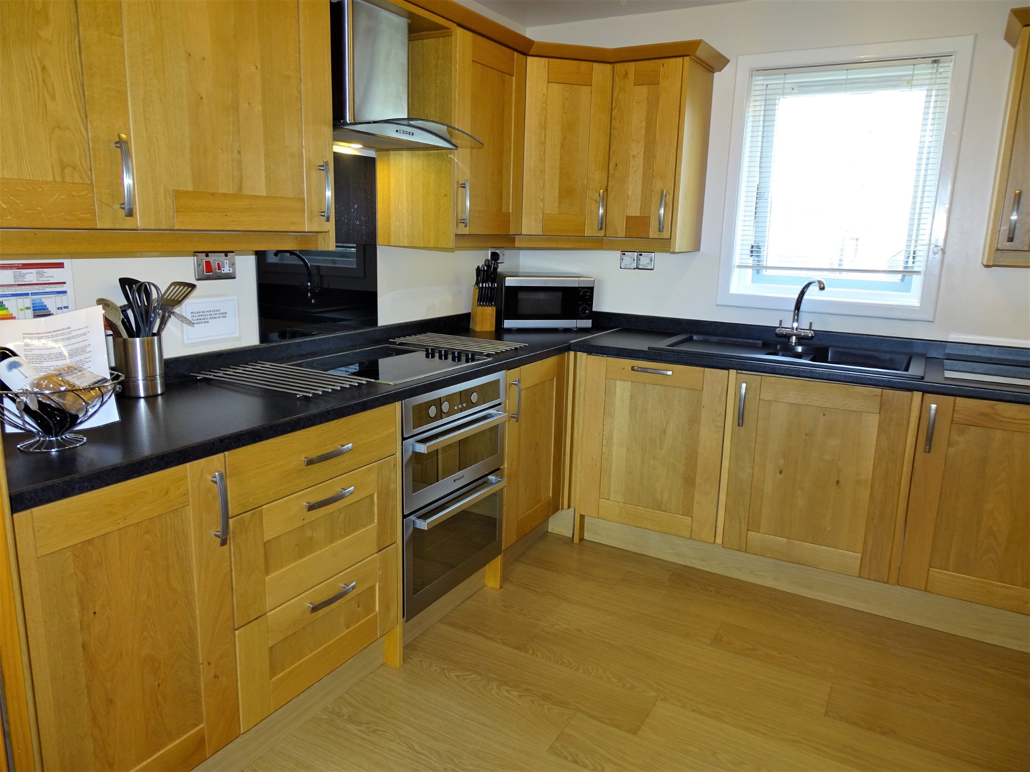 A carefully planned kitchen with beautiful solid oak fitted units and black satin worktops comes complete with fully-integrated dishwasher, double oven, washing machine, microwave and large fridge/freezer as well as a quality range of crockery and cutlery.