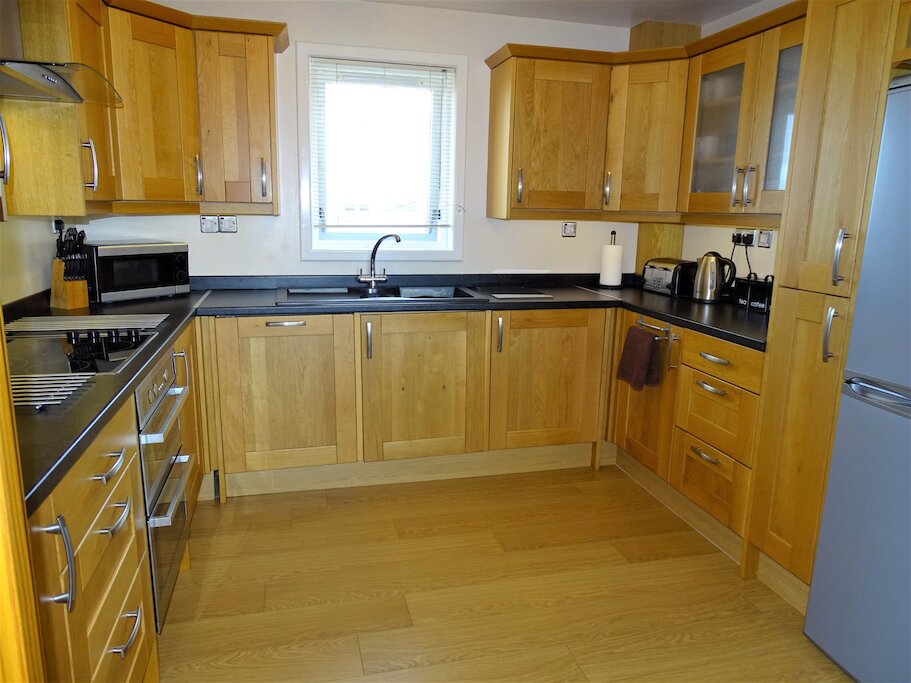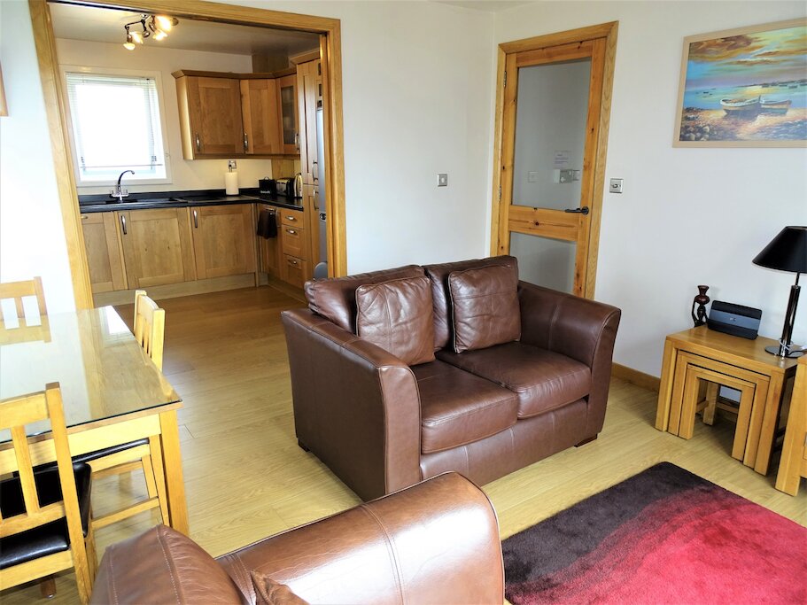 This luxury, well-equipped property boasts an open-plan kitchen/dining/living room with quality leather sofas, flatscreen LCD TV with Freeview channels, DVD player and Hifi system. The lounge and dining area both have amazing sea views either southwards over the golf course and the beautiful Breiwick Bay or northwards over Lerwick and out towards the north mouth of the harbour.