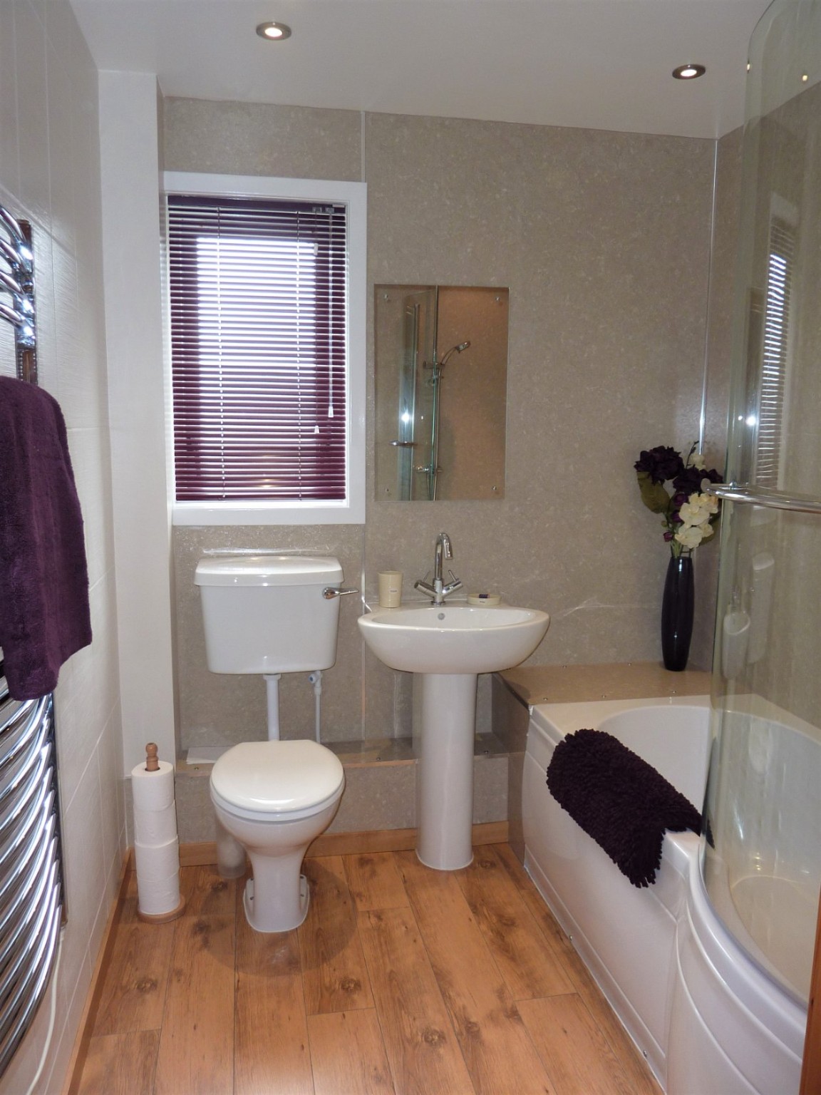 The luxurious bathroom comprises WC, washbasin, curved bath with overhead mains power shower and heated towel-rail.