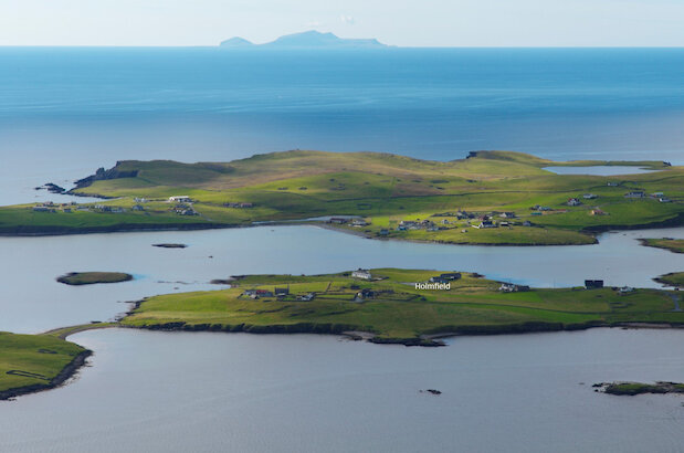 From Lerwick it is a 25 minute drive to Holmfield using either the north or south roads. Follow the signs for Scalloway and before you reach Scalloway turn left, signposted Burra. Drive over the bridge to Trondra and another bridge which takes you on to Burra. Drive south through Burra following the signs to Houss. Just before the end of the road turn right signposted Meadows Road. Holmfield is at the end of Meadows road.