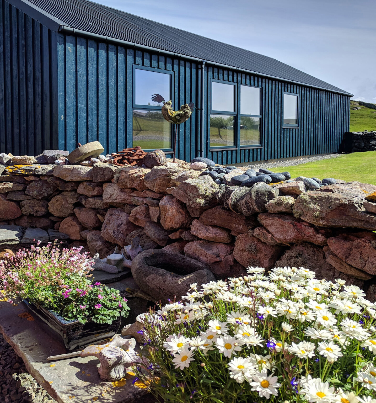 There are usually friendly Shetland ponies grazing on our neighbour's croft. From the house you can walk in the open countryside of East Burra and along the interesting coastline. The meadows around Holmfield are full of flowers in the summer and attract birdlife. We often see seals and otters cross our land.