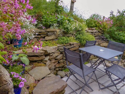 Private Patio (sitooterie) with chairs and table and small garden with washing line.