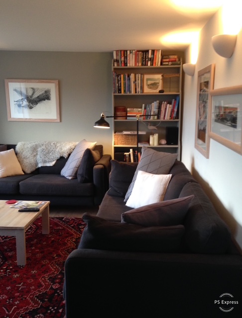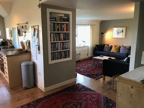 Open-plan Kitchen/Dining/Living area equipped with dishwasher, fridge, electric oven, ceramic hob, Nespresso coffee machine, kettle, toaster, microwave, iron, excellent range of kitchen equipment, dining table and chairs. The living area has two comfy three-seater sofas, multi fuel stove, Smart TV with Netflix, loads of books, maps, games, DVDs.