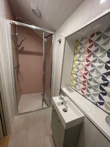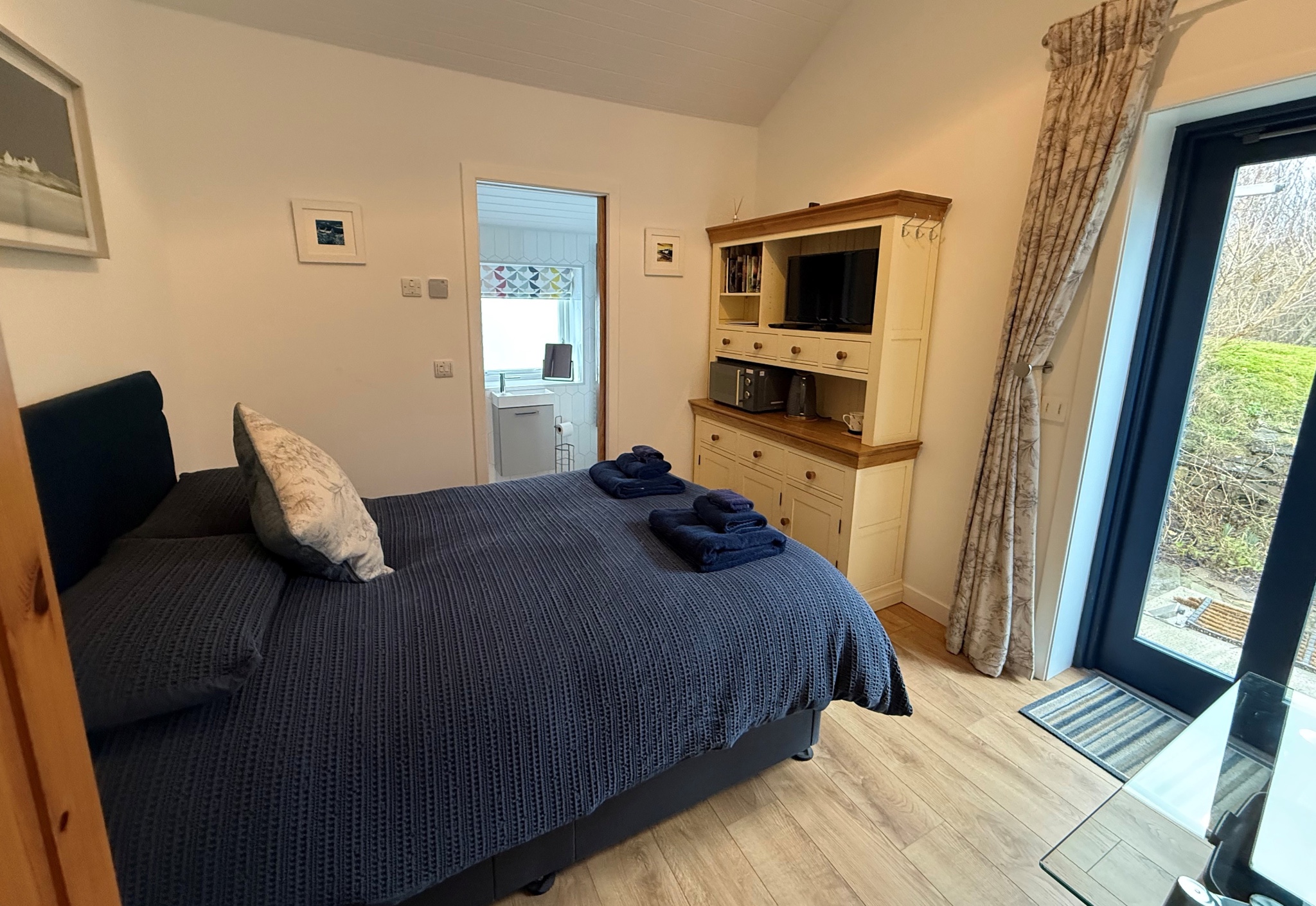 This snug double room offers garden views, an ensuite with shower, underfloor heating, table for two and handy basic self‑catering facilities including microwave, mini fridge and kettle - perfect for simple meals. Wi‑Fi, TV, parking, bicycle storage, hairdryer and complimentary tea, coffee, milk and porridge pots also included.